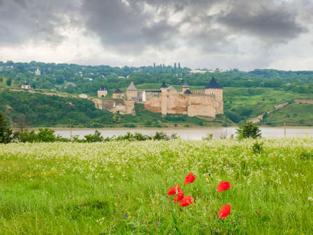 Khotyn fortress built in the 14th century. General view of fortress from the opposite left bank of the Dniester river with grass and flowers on foreground in cloudy weather, Ukraine