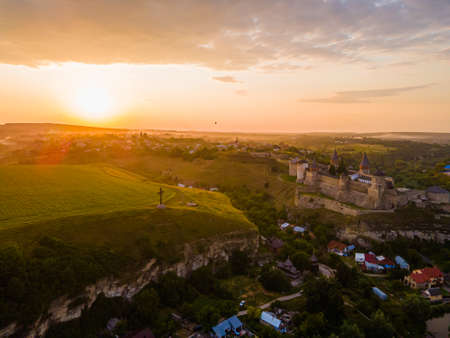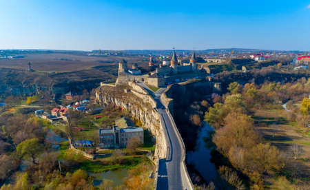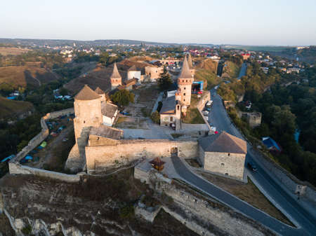 Kamianets-Podilskyi, Ukraine - AUGUST 31 2017: Aerial view of Kamianets-Podilskyi castle in Ukraine. The fortress located among the picturesque nature in the historic city of Kamianets-Podilskyi, Ukraine.