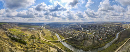 Aerial drone panorama view of a village located near a river and hills, fields, godrays, clouds in Moldova