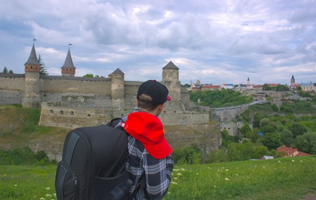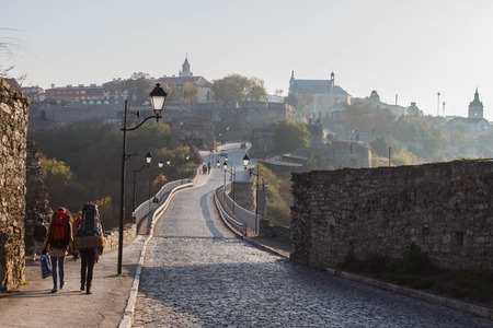 tourists on background of road from old castle Kamenetz-Podolsk, Ukraine