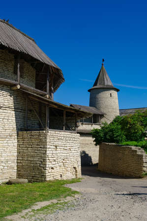 Fortress wall and zahab in Trinity tower of the medieval Pskov Kremlin. Pskov, Russia