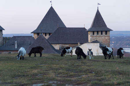 Goats graze on a hill near the Khotyn Fortress