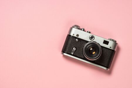 Old film camera on pink background.