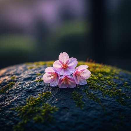 Colorful petals blanket the ground as sunlight sets in a serene outdoor setting