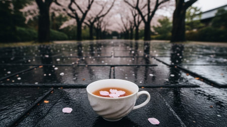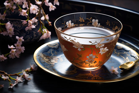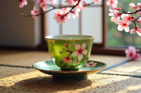 Green floral teacup on woven mat with pink blossoms by window. That the image is generated using AI.