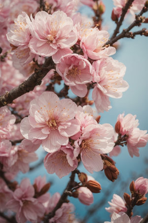 Blooming pink plum blossom flowers on branches against a blue sky in winter, Wuhan, China. Botanical close-up with shallow depth of field, vibrant color.