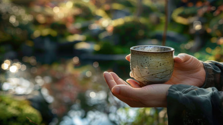 The close up picture of the person is holding the cup of the coffee by their own hand to relax inside the garden for relaxation also surrounded by the different kind of the trees and plants. AIG43.