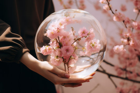 Fallen sakura on a girl's hand at Kumagaya Arakawa Ryokuchi Park in Kumagaya,Saitama,Japan.Also known as Kumagaya Sakura Tsutsumi
