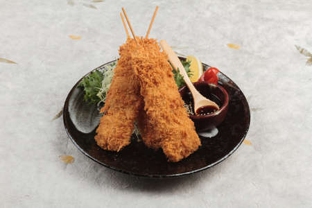 Salmon tempura sticks is deep fried salmon mixing with tempura flour served with sweet sauce, sliced cabbage, lemon, tomato and lettuce in black plate on washi (Japanese paper).
