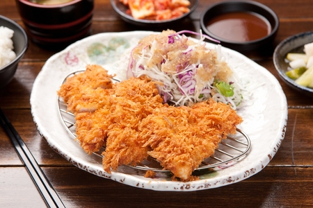 Japanese deep fried pork chop or menchikatsu style with sauce and vegetable salad set.
