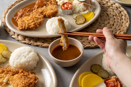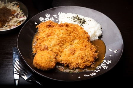 Japanese food, fried pork cutlet with curry sauce and rice in a restaurant