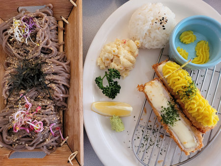 Close up shot a Japanese style Lunch box with deep fried pork cutlet and chicken cutlet at Las Vegas, Nevada