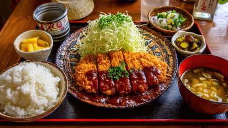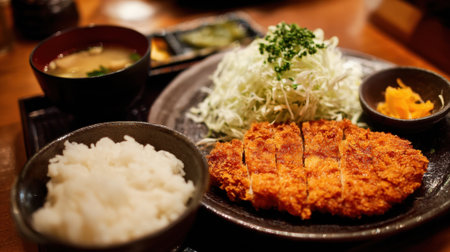 A mouthwatering Japanese katsu dish served on a rustic table, featuring crispy fried meat, steamed rice, fresh greens, and savory sauce, perfect for food lovers.