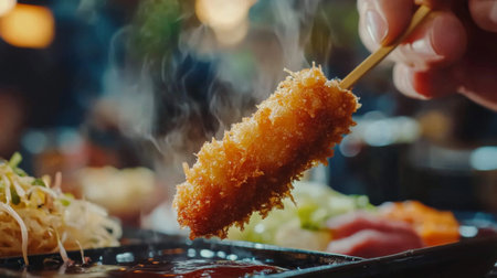 A close-up of a kushikatsu skewer being dipped into a flavorful sauce, highlighting the crispy texture and delicious ingredients, with a blurred background of a Japanese restaurant.