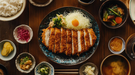 An artistic overhead view of a tonkatsu meal, featuring the cutlet alongside a colorful array of side dishes like rice, miso soup, and pickled vegetables on a wooden table.