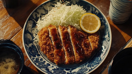 A beautifully plated crispy pork cutlet alongside fresh cabbage and a slice of lemon, showcasing delicious Japanese cuisine and culinary art.
