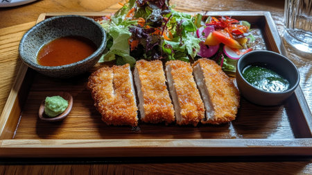 Enjoy a vibrant Japanese katsu meal featuring crispy pork cutlets served with fresh vegetables and savory sauce on a rustic wooden table.