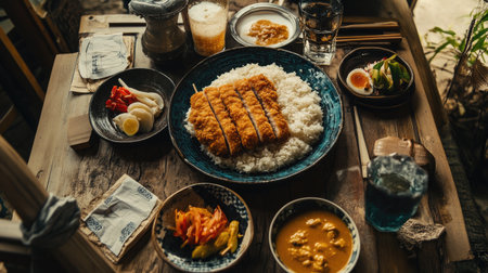 A serene shot of curry rice paired with tonkatsu, elegantly presented on a wooden tray, creating a warm and inviting atmosphere for enjoying a comforting meal