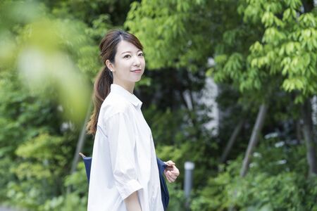 Asian woman wearing a white shirt and taking a walk in a relaxing atmosphere