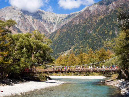 Kappa bashi Bridge, Kamikochi national park, Nagano, Japan - October 2022: Kamikochi during Fall Foliage season with beautiful nature on snow mountain and Leaf change from green to