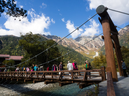 Matsumoto, Japan - October 7, 2015: Tourists crossing the Kappa-bashi bridge in picturesque Kamikochi Valley