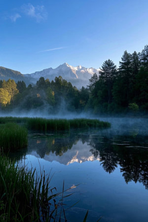 A body of water set against a backdrop of towering mountains and dense forest, creating a stunning natural landscape.