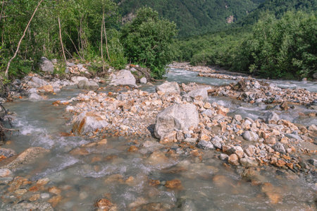 The bubbling clear water of a mountain river with large stones high in the mountains. Clean water flows down from a glacier in the mountains. Landscape in the mountains. Uncontaminated environment.