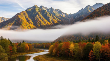 a vibrant autumn landscape featuring colorful trees, a flowing river, and mountains