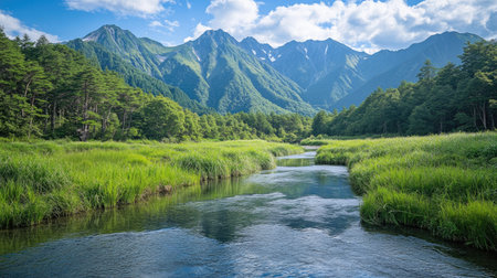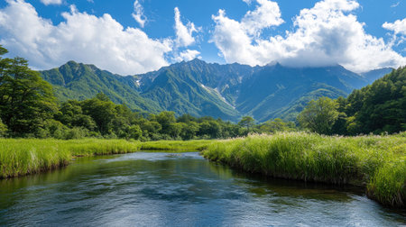 Majestic Hotaka Mountains overlooking the peaceful Azusa River in Kamikachi, surrounded by fresh greenery, capturing the untouched beauty of Nagano's natural landscape.