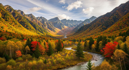 An autumn landscape showcases a river meandering through a valley surrounded by vibrant trees and mountains. The scene features warm colors, with orange, yellow, and green foliage. Sunlight illuminates the composition. This image could be suitable for various editorial or commercial projects.