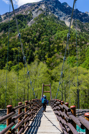 KAMIKOCHI, JAPAN - MAY 24 2023: Hikers crossing the Myojin suspension bridge over the Azusa River in Kamikochi, Nagano, Japan