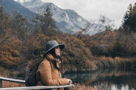 A young woman admiring beautiful autumn forest and a lake in Zelenci nature reserve, Slovenia.