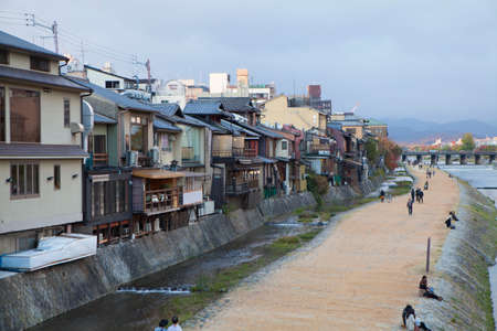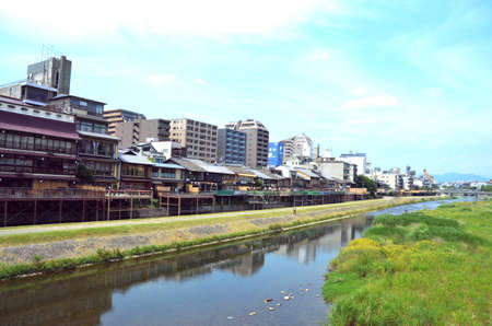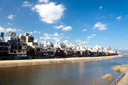 View of traditional houses by the Kamo river in Kyoto, Japan.
