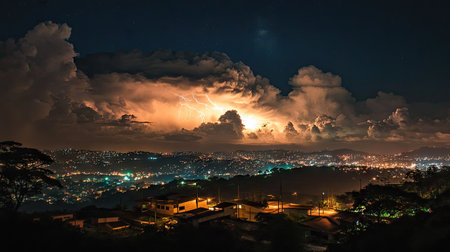 Lightning storm over Maring with streaks of light cutting through the clouds, a breathtaking view of the city's night sky.