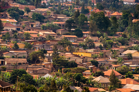 View of small, closely packed houses on a hillside in Nyamirambo, a semi-rural suburb of Kigali, Rwanda