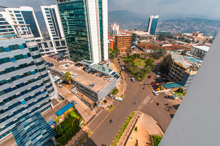 Kigali, Rwanda - September 21, 2018: a wide view looking down on the city centre roads with Ecobank and Pension Plaza looming in the foreground and Kigali City Tower in the background against a backdrop of distant blue hills
