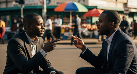 Two african adult males in suits engaged in intense outdoor discussion