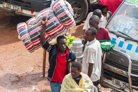 KAMPALA, UGANDA - OCTOBER 03, 2012. A man carries a mattress above his head at the taxi park in Kampala, Uganda on October 03,2012.