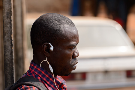CENTRAL REGION, GHANA - Jan 17, 2017: Unidentified Ghanaian man in plaid shirt with headphones and backpack in local village. People of Ghana suffer of poverty due to the bad economy