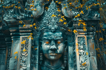 AI Generated. Ornate ancient temple entrance with carved stone facade stands majestically