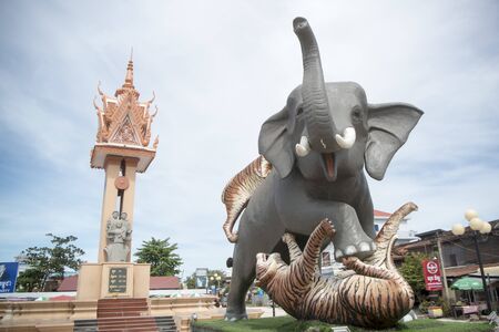 the clock tower and the Elephant stepping on Tiger Monument in the city centre of Kampong Thom of Cambodia. Cambodia, Kampong Thom, November, 2017,