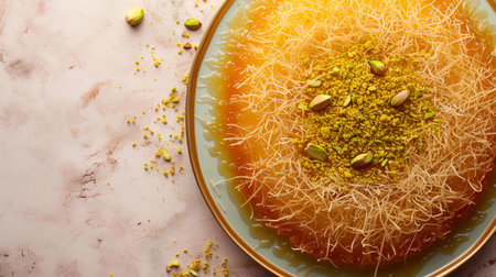 turkish Kunafa Dessert Topped with Pistachios and Served on a Plate