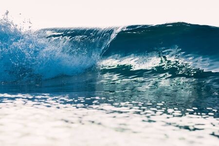 Ocean wave at sunset time. Blue ocean wave with sunbeams