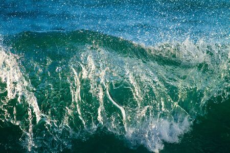 Aquamarine sea wave with foam, lit by the sunlight. Photo with blur in motion.