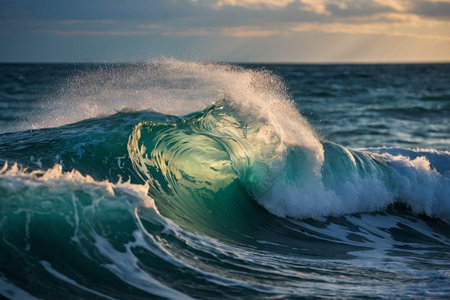 A vibrant wave curls beautifully as sunlight sparkles off its surface at dusk, capturing the essence of nature.
