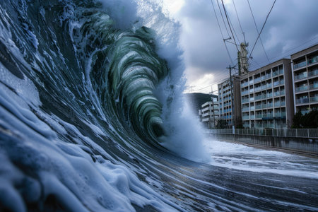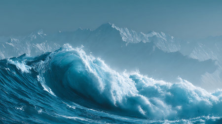 A massive wave curls dramatically as it crashes onto the shore, creating a mist in the air.