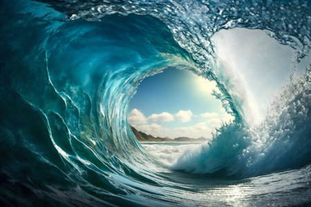 Big ocean clear blue surfer wave tube closeup. Generative AI. high quality illustration