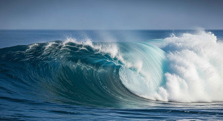 CloseUp Ocean Wave Curling With Spray, Majestic Blue Barrel, HighSpeed Capture Of Translucent Water,
