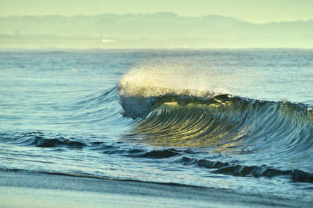 Glassy wave at sunrise. Breaking ocean wave with warm colors, swell for surfing