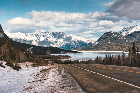Beautiful scenery of Highway road with rocky mountains and frozen lake at Icefields Parkway, Alberta, Canada